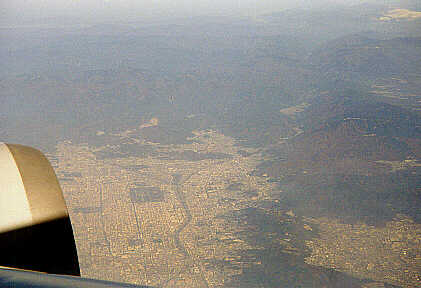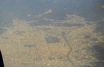 Position: south of Fushimi direction of view: northnortheast the rectangular green area in the middle is the Imperial Palace, above and right the Kamo-gawa, from the upper right edge is Takano-gawa coming. This photo is available in full screen size (70 kB). |